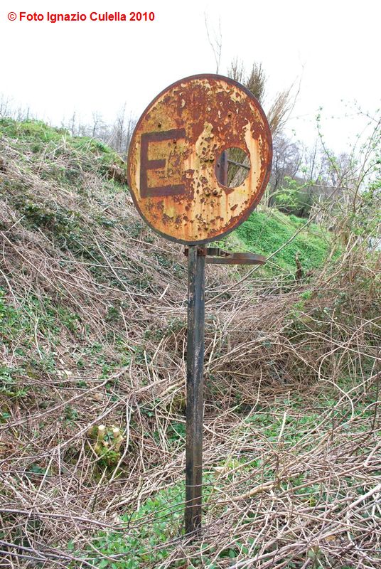 ![]() Lo stesso segnale di protezione ad ala semaforica della foto precedente come appare oggi, quasi irriconoscibile nascosto com’è dai fasci di canne e dalla rigogliosa vegetazione che lo circonda |