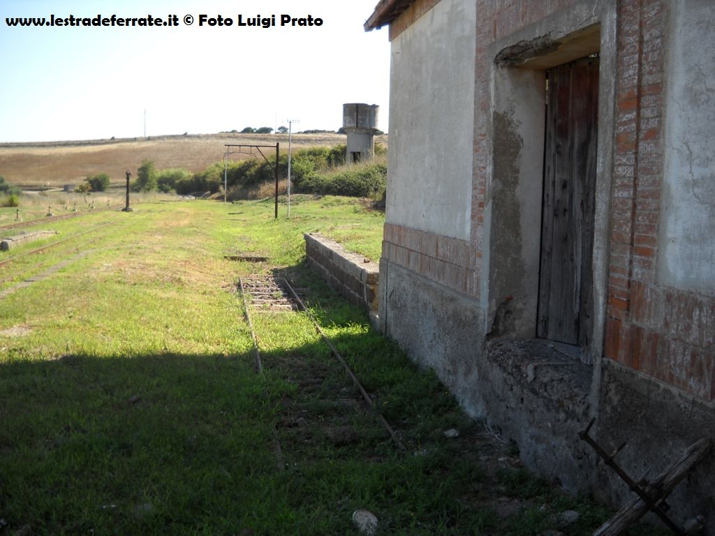 ![]() Le ritirate (in primo piano) con il fabbricato viaggiatori ed il primo dei due rifornitori d’acqua in stazione, ripresi dal lato sud, con i binari diretti a Laerru |