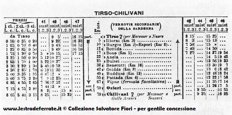 L'orario della linea nel 1893 (in alto) e nel 1894 (in basso): l’apertura della linea avvenne con 4 coppie di corse tutte su treno misto con servizio viaggiatori di I, II e III classe; il treno 44 che partiva da Chilivani alle 9.25 arrivava dopo mezz’ora a Ozieri dove si scendeva per ripartire (dopo una sosta di circa un’ora e mezza) alle 11.26 sul treno 46 che arrivava a Tirso dopo 4 ore (!!) di viaggio. Qui si accedeva successivamente alle coincidenze per Macomer e Nuoro. I treni misti in quel periodo erano composti da locomotiva Winterthur più carrozze viaggiatori, carri bagagli e carri merci Castellammare (Collezione Salvatore Fiori - per gentile concessione) Dai pochi dati in nostro possesso (elab. STC su dati Ferrovie della Sardegna), risulta che la linea nel 1899 comprendeva il seguente numero di fabbricati: 10 stazioni, tra cui (a parte quella di Chilivani, in comune con le Ferrovie Reali, e lo scalo di Tirso sulla ferrovia Macomer - Nuoro) erano comprese: - 1 di prima classe (Ozieri) - 7 di terza classe (Pattada, Buddusò, Benetutti/Nule, Bultei, Anela, Bono e Bottidda) 4 fermate (Vigne, Osidda, Burgos/Esporlatu, Illorai) 7 cantoniere doppie 47 caselli (o cantoniere semplici) 14 ponti 12 passaggi a livello su strada 113 passaggi a livello su sentieri di campagna. Per quanto concerne le pendenze, la situazione si presentava come segue. Salite (da Tirso a Chilivani): metri 36.219,64 (46,12%) di cui - 30 per mille: metri 2.938,64 (3,74%) - tra 29 e 20 per mille: metri 22.320,00 (28,42%) - tra 19 e 10 per mille: metri 4.436,00 (5,65%) - tra 9 e 0 per mille: metri 6.525,00 (8,31%). Discese (da Tirso a Chilivani): metri 32.387,93 (41,25%) di cui - tra 29 e 20 per mille: metri 23.650,05 (30,12%) - tra 19 e 10 per mille: metri 4.585,22 (5,84%) - tra 9 e 0 per mille: metri 4.152,66 (5,29%). Il percorso orizzontale aveva a sua volta una lunghezza di 9.965,43 metri, per una percentuale equivalente al 12,63% del tragitto totale. Molto scarsi anche i dati per ciò che concerne il numero delle corse. L’unica notizia certa da noi reperita riguarda l’anno 1918 (Guida del Touring Club Italiano per la Sardegna, a cura di L. V. Bertarelli, pag. 166) durante il quale il servizio prevedeva una corsa al giorno con locomotiva tipo Winterthur e carrozze di I e II classe (del costo rispettivamente di lire 7,80 e lire 4,55) per il tragitto da Chilivani fino a Nuoro, di complessivi chilometri 115 in un tempo di percorrenza pari a sei ore e mezza, comprendente la sosta di circa un quarto d’ora allo scalo di Tirso per le coincidenze da Macomer e da Nuoro; un notevole progresso per una Regione d’Italia come la Sardegna dove il cavallo rimaneva pressoché l’unico mezzo rapido di locomozione! Nel 1921, con la costituzione della Società per le Ferrovie Complementari della Sardegna (FCS), la linea fu compresa nel compartimento FCS di Macomer, unitamente alle tratte Macomer - Nuoro e Macomer - Bosa, che nel 1933 disponeva ancora di 20 antiquate locomotive a vapore di cui 18 svizzere Winterthur oltre a 2 tedesche Henschel, le quali ormai fornivano prestazioni molto modeste. È stato scritto che uno dei limiti della Chilivani - Tirso che portò alla sua chiusura era rappresentato dal tempo di percorrenza eccessivamente lungo, che negli anni ’50 era ancora lo stesso del 1893, e si è creduto di individuare la causa di ciò nel percorso eccessivamente tortuoso del tracciato ferroviario. Ma a ben vedere, ci si accorge come tale argomentazione sia poco consistente; la Strada Statale 128 bis, dove per parecchi anni hanno transitato (e transitano tuttora) gli autobus del servizio sostitutivo delle ferrovie complementari sarde, è molto più contorta della ferrovia (è sufficiente dare un’occhiata sul programma Google Earth per rendersene conto) e la vera causa della lentezza dei treni era data in realtà dalla obsolescenza ed usura di mezzi ormai antiquati come le summenzionate vetuste “caffettiere” a vapore, autentici pezzi da museo che avevano alle spalle oltre mezzo secolo di onorata attività.